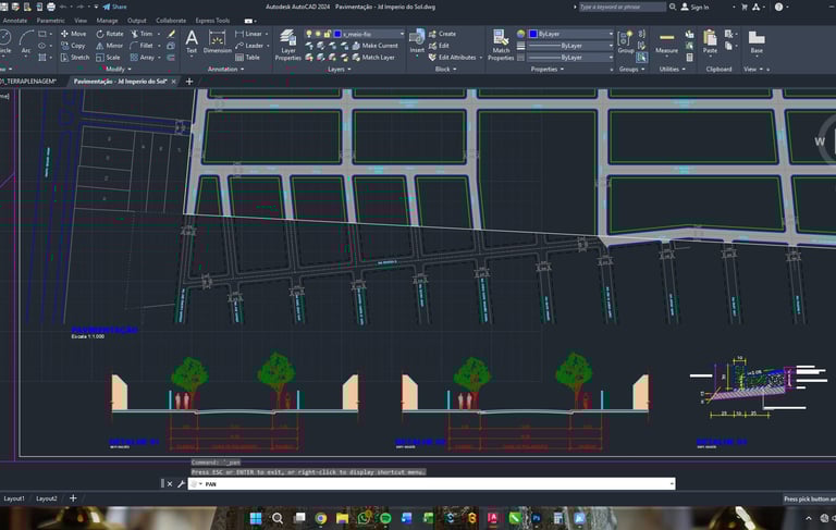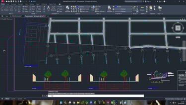 Os projetos contemplam a definição geométrica completa das vias, incluindo alinhamentos, perfis longitudinais, seções transversais e dispositivos auxiliares, assegurando adequada drenagem superficial e conforto ao usuário. Essa etapa é fundamental para a correta integração da pavimentação com o sistema viário existente e para a prevenção de patologias decorrentes de falhas de traçado ou escoamento superficial inadequado.