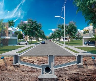 Projetos de sistemas de drenagem pluvial, contemplando galerias, bocas de lobo, poços de visita e dispositivos de captação, com dimensionamento hidráulico e detalhamento construtivo completo.
