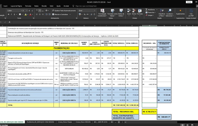 Como parte integrante do serviço, são elaborados memoriais descritivos, especificações técnicas, desenhos executivos e planilhas orçamentárias, compatíveis com os padrões exigidos em contratações públicas. A documentação é desenvolvida de forma clara e objetiva, facilitando os processos de licitação, fiscalização e execução das obras de recapeamento.