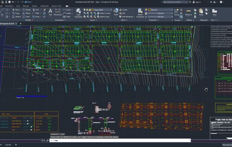 Os projetos contemplam o traçado das redes, definição de diâmetros, localização de válvulas, registros, ventosas, poços de visita e demais dispositivos necessários ao correto funcionamento dos sistemas. A concepção das soluções busca assegurar a integração com a infraestrutura urbana existente, facilidade de operação e manutenção, além de compatibilidade com as condições locais e com os sistemas já implantados.
